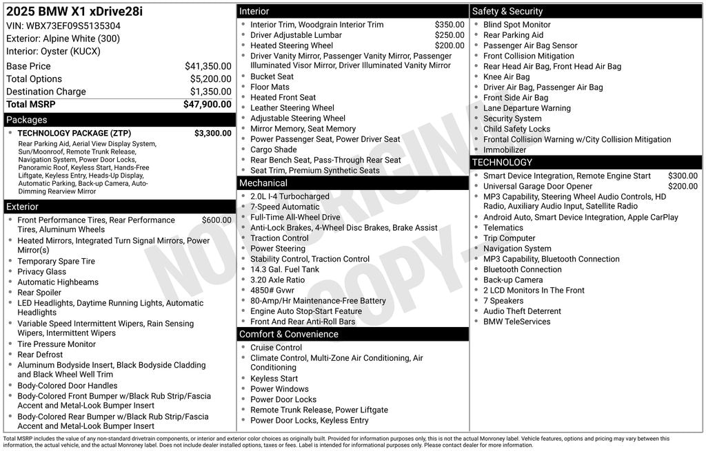 Audi VW Lenox & BMW of Lenox is proud to present you with another True Market Priced Pre-Owned Vehicle. Transparent Pricing Of $ 41898 !! This 2025 BMW X1 xDrive28i is loaded with the following Factory Options: Technology Package (Anti-Theft Recorder, Auto-Dimming Interior and Exterior Mirrors, Auto-Dimming Rear-View Mirror, BMW Digital Key Plus with UWB, Comfort Access Keyless Entry, Head-Up Display, Live Cockpit Pro, Panoramic Moonroof, Parking Assistant Plus, Premium Content 1, Surround View with 3D View, and Wireless Device Charging), 4-Wheel Disc Brakes, 7 Speakers, ABS brakes, Active Driver Seat with Lumbar Support, Air Conditioning, Alloy wheels, AM/FM Radio, AM/FM radio: SiriusXM with 360L, Apple CarPlay and Android Auto Compatibility, Apple CarPlay Compatibility, Auto High-beam Headlights, Automatic temperature control, BMW Assist ECall, BMW TeleServices, Brake assist, Bumpers: body-color, Compass, Delay-off headlights, Driver door bin, Driver vanity mirror, Dual front impact airbags, Dual front side impact airbags, Electronic Stability Control, Emergency communication system: BMW Assist eCall, Exterior Parking Camera Rear, Four wheel independent suspension, Front anti-roll bar, Front Bucket Seats, Front Center Armrest w/Storage, Front dual zone A/C, Front reading lights, Heated door mirrors, Heated Front Seats, Heated front seats, Heated Steering Wheel, Illuminated entry, Knee airbag, Leather steering wheel, Low tire pressure warning, Memory seat, Navigation, Navigation System, Occupant sensing airbag, Outside temperature display, Overhead airbag, Overhead console, Panic alarm, Passenger door bin, Passenger vanity mirror, Perforated Veganza Upholstery, Personal ESIM 5G, Power door mirrors, Power driver seat, Power Front Seats, Power Liftgate, Power passenger seat, Power steering, Power windows, Radio data system, Rain sensing wipers, Rear anti-roll bar, Rear reading lights, Rear seat center armrest, Rear window defroster, Rear window wiper, Remote Engine Start, Remote keyless entry, Security system, SiriusXM with 360L and 1 Year Platinum Plan Subscription, Speed control, Speed-sensing steering, Speed-Sensitive Wipers, Split folding rear seat, Spoiler, Steering wheel mounted audio controls, Tachometer, Telescoping steering wheel, Tilt steering wheel, Traction control, Trip computer, Turn signal indicator mirrors, Universal Garage-Door Opener, Variably intermittent wipers, Wheels: 18" x 7.5" V-Spoke Bi-Color, Wheels: 19" x 8.0" Y-Spoke, and Widescreen Display!!