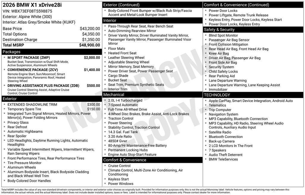 Audi VW Lenox & BMW of Lenox is proud to present you with another True Market Priced Vehicle. This 2026 BMW X1 xDrive28i is loaded with the following Factory Options: Convenience Package (Heated Steering Wheel, Panoramic Moonroof, and Remote Engine Start), Driving Assistance Plus Package (Distance Control (ACC) with Steering Assistant and Driving Assistance Plus), M Sport Package, 4-Wheel Disc Brakes, 7 Speakers, ABS brakes, Adaptive M Suspension, Air Conditioning, Alloy wheels, AM/FM Radio, AM/FM radio: SiriusXM with 360L, Apple CarPlay and Android Auto Compatibility, Apple CarPlay Compatibility, Auto High-beam Headlights, Auto-dimming door mirrors, Auto-dimming Rear-View mirror, Automatic temperature control, BMW Assist ECall, BMW TeleServices, Brake assist, Bumpers: body-color, Compass, Delay-off headlights, Driver door bin, Driver vanity mirror, Dual front impact airbags, Dual front side impact airbags, Electronic Stability Control, Emergency communication system: BMW Assist eCall, Extended Shadowline Trim, Exterior Parking Camera Rear, Four wheel independent suspension, Front anti-roll bar, Front Bucket Seats, Front Center Armrest w/Storage, Front dual zone A/C, Front reading lights, Heated door mirrors, Heated Front Seats, Heated front seats, Illuminated entry, Knee airbag, Leather steering wheel, Low tire pressure warning, M Sport Content, M Sport Exterior Elements, M Sport Interior Elements, M Steering Wheel, Memory seat, Navigation, Navigation System, Occupant sensing airbag, Outside temperature display, Overhead airbag, Overhead console, Panic alarm, Passenger door bin, Passenger vanity mirror, Perforated Veganza Upholstery, Personal ESIM 5G, Power door mirrors, Power driver seat, Power Front Seats, Power Liftgate, Power passenger seat, Power steering, Power windows, Radio data system, Rain sensing wipers, Rear anti-roll bar, Rear reading lights, Rear seat center armrest, Rear window defroster, Rear window wiper, Remote keyless entry, Roof Rails in High Gloss Shadowline, Security system, Shadowline Exterior Trim, SiriusXM with 360L and 1 Year Trial Subscription, Space-Saver Spare, Speed control, Speed-sensing steering, Speed-Sensitive Wipers, Split folding rear seat, Spoiler, Sport Seats, Steering wheel mounted audio controls, Tachometer, Telescoping steering wheel, Tilt steering wheel, Traction control, Trip computer, Turn signal indicator mirrors, Variably intermittent wipers, Wheels: 18" x 7.5" M V-Spoke Bi-Color, Wheels: 18" x 7.5" V-Spoke Bi-Color, Widescreen Display, Wireless Device Charging, and Without Lines Designation Outside!!