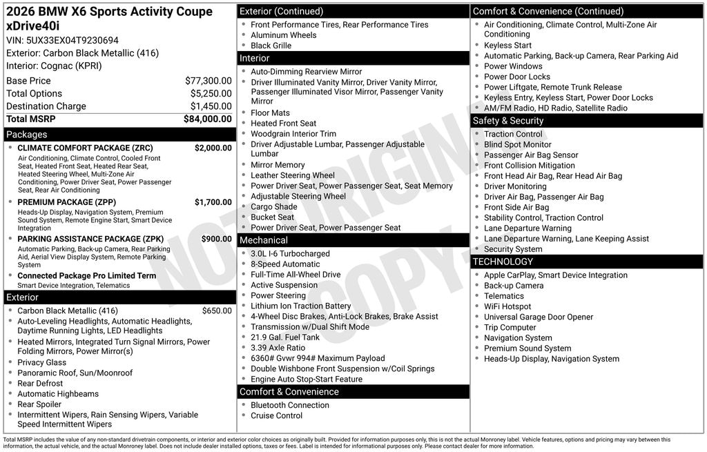 Audi VW Lenox & BMW of Lenox is proud to present you with another True Market Priced Vehicle. This 2026 BMW X6 xDrive40i is loaded with the following Factory Options: Cognac Leather Climate Comfort Package (4-Zone Automatic Climate Control, Front Ventilated Seats, and Multi-Contour Seats), Connected Package Pro Limited Term, Parking Assistance Package (Active Park Distance Control, Automatic Park Assistant, Backup Assistant, Parking Assistant Professional, Rear-View Camera, and Trailer Assistant), Premium Package (Live Cockpit Pro and Remote Engine Start), Cognac Leather, 10 Speakers, 4-Wheel Disc Brakes, ABS brakes, Adaptive suspension, Air Conditioning, Alloy wheels, AM/FM radio: SiriusXM with 360L, AM/FM Stereo, Apple CarPlay Compatibility, Auto High-beam Headlights, Auto tilt-away steering wheel, Auto-dimming door mirrors, Auto-dimming Rear-View mirror, Automatic temperature control, BMW TeleServices, Brake assist, Bumpers: body-color, Compass, ConnectedDrive Services, Delay-off headlights, Driver door bin, Driver vanity mirror, Dual front impact airbags, Dual front side impact airbags, Electronic Stability Control, Emergency communication system: BMW Assist eCall, Exterior Parking Camera Rear, Fineline Black Wood Trim, Four wheel independent suspension, Front anti-roll bar, Front Bucket Seats, Front Center Armrest, Front dual zone A/C, Front reading lights, Fully automatic headlights, Garage door transmitter, Genuine wood console insert, Genuine wood door panel insert, Head restraints memory, Heated door mirrors, Heated Front Seats, Heated front seats, Hi-Fi Sound System, Illuminated entry, Leather steering wheel, Low tire pressure warning, Lumbar Support, Memory seat, Navigation, Navigation System, Occupant sensing airbag, Outside temperature display, Overhead airbag, Overhead console, Panic alarm, Passenger door bin, Passenger vanity mirror, Power adjustable front head restraints, Power door mirrors, Power driver seat, Power Front Seats, Power Liftgate, Power moonroof, Power passenger seat, Power steering, Power windows, Radio data system, Rain sensing wipers, Rear anti-roll bar, Rear reading lights, Rear seat center armrest, Rear window defroster, Remote keyless entry, Security system, Sensafin Upholstery, Speed control, Speed-sensing steering, Speed-Sensitive Wipers, Split folding rear seat, Spoiler, Sport Seats, Sport steering wheel, Steering wheel memory, Steering wheel mounted audio controls, Tachometer, Telescoping steering wheel, Tilt steering wheel, Traction control, Trip computer, Turn signal indicator mirrors, Variably intermittent wipers, and Wireless Device Charging!!