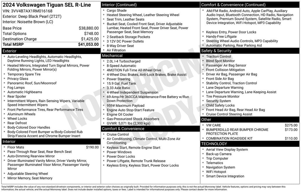 Audi VW Lenox & BMW of Lenox is proud to present you with another True Market Priced Pre-Owned Vehicle. Transparent Pricing Of $ 29456 !! This 2024 Volkswagen Tiguan 2.0T SEL R-Line is loaded with the following Factory Options: AWD AWD, 2-Row Rubber Monster Mats (Set of 4), 3.33 Axle Ratio, 4-Wheel Disc Brakes, 4-Wheel Independent Suspension, 8 Speakers, ABS brakes, Air Conditioning, Alloy wheels, AM/FM radio: SiriusXM with 360L, Auto High-beam Headlights, Auto-dimming Rear-View mirror, Automatic temperature control, Brake assist, Bumperdillo Rear Bumper Chrome Protection Plate, Bumpers: body-color, Compass, Delay-off headlights, Driver door bin, Driver vanity mirror, Dual front impact airbags, Dual front side impact airbags, Electronic Stability Control, Emergency communication system: VW Car-Net Safe & Secure 5-year, Exterior Parking Camera Rear, First Aid Kit, Four wheel independent suspension, Front anti-roll bar, Front Bucket Seats, Front Center Armrest, Front dual zone A/C, Front fog lights, Front reading lights, Fully automatic headlights, Heated & Actively Ventilated Front Seats, Heated door mirrors, Heated front seats, Heated steering wheel, Illuminated entry, Leather Shift Knob, Leather steering wheel, Low tire pressure warning, Memory seat, Navigation system: VW Car-Net Guide & Inform, Occupant sensing airbag, Outside temperature display, Overhead airbag, Overhead console, Panic alarm, Passenger door bin, Passenger vanity mirror, Perforated Vienna Leather Seating Surfaces, Power door mirrors, Power driver seat, Power Liftgate, Power moonroof, Power passenger seat, Power steering, Power windows, Radio data system, Radio: MIB3 Discover Media AM/FM/HD, Rain sensing wipers, Rear anti-roll bar, Rear reading lights, Rear seat center armrest, Rear window defroster, Rear window wiper, Remote keyless entry, Roadside Assistance Kit, Security system, Speed control, Speed-sensing steering, Split folding rear seat, Spoiler, Sport steering wheel, Steering wheel mounted audio controls, Tachometer, Telescoping steering wheel, Tilt steering wheel, Traction control, Trip computer, Turn signal indicator mirrors, Variably intermittent wipers, Ventilated front seats, VW Care, and Wheels: 20" 2-Tone Machined Alloy!!